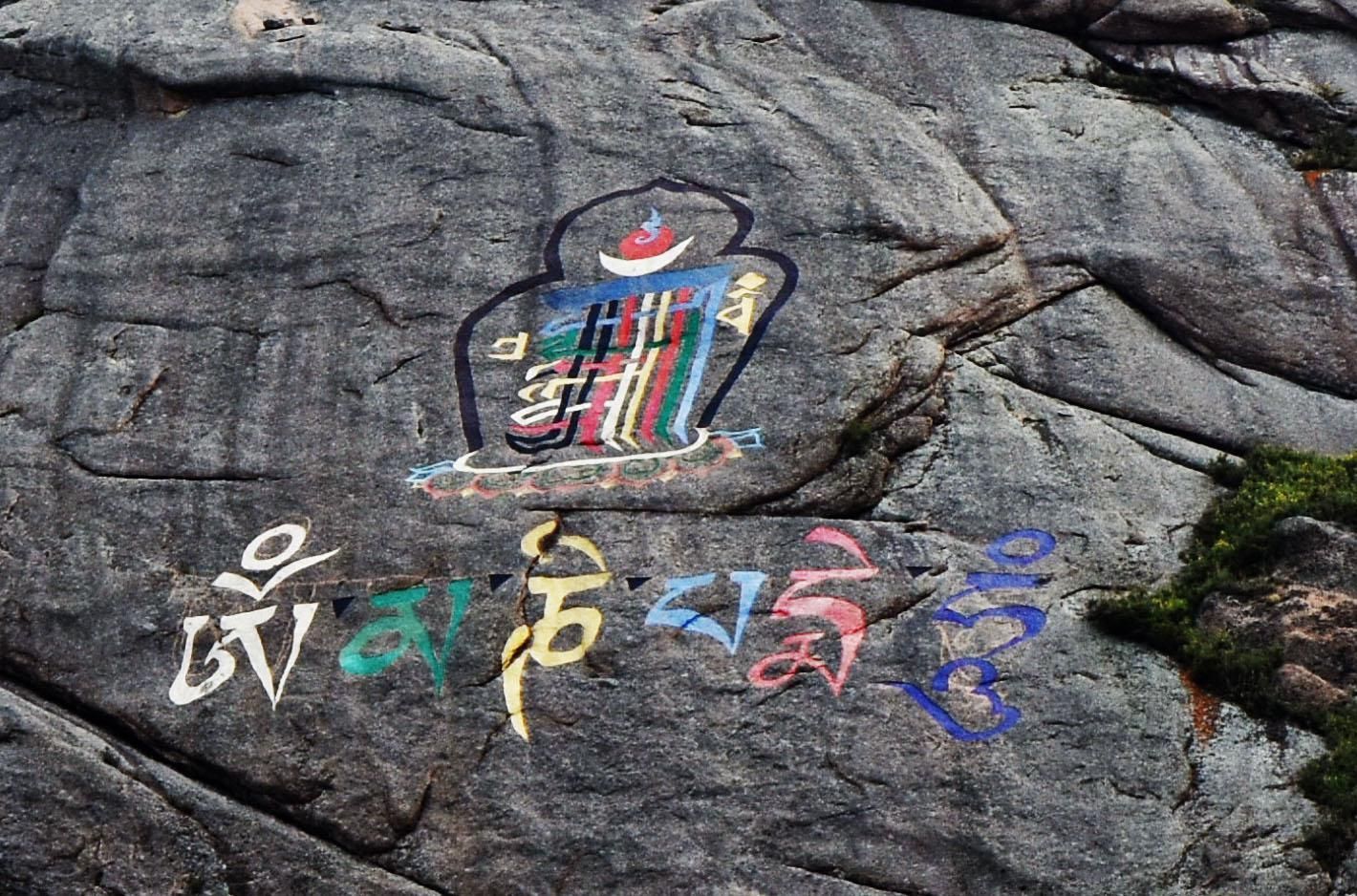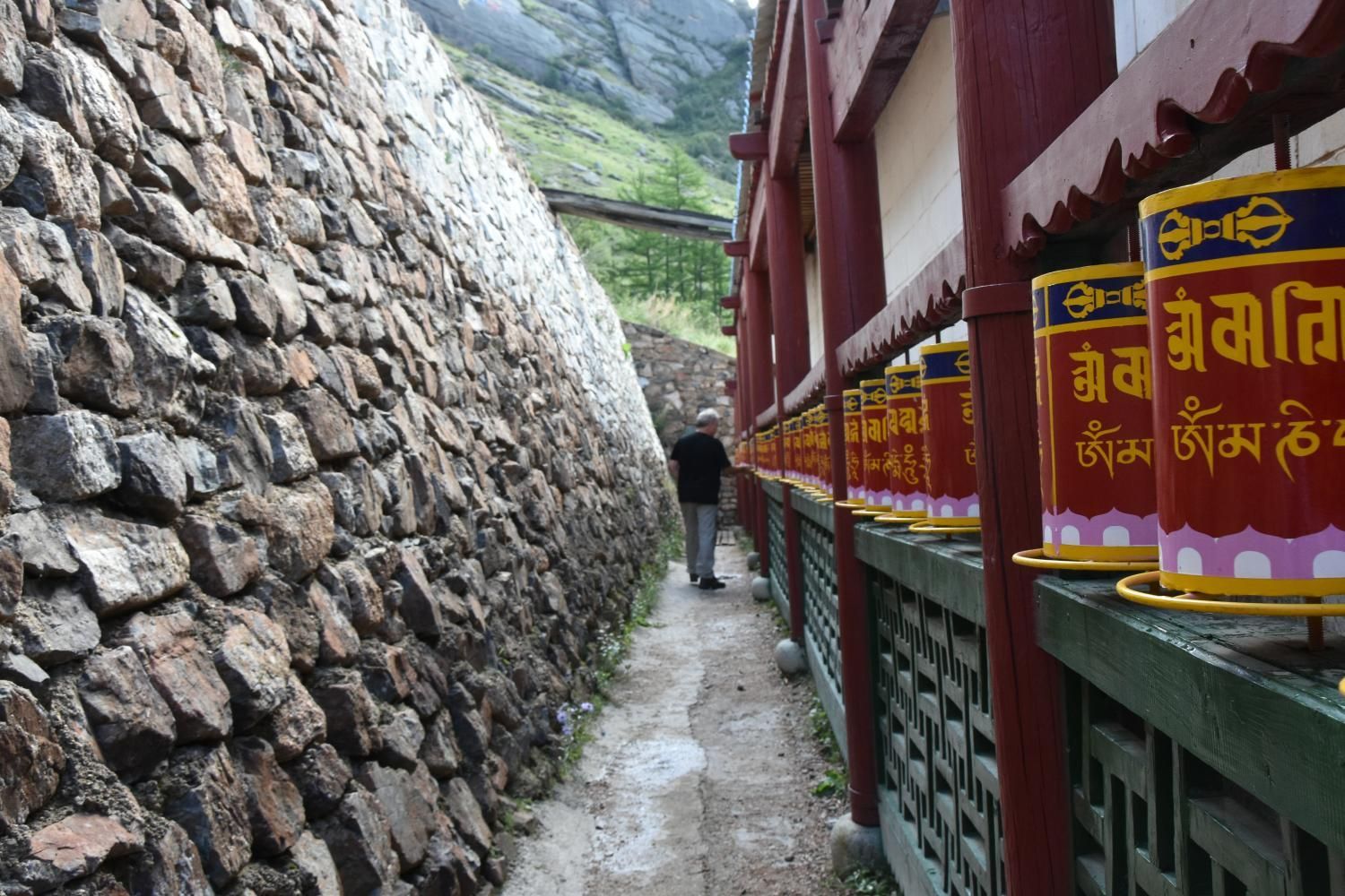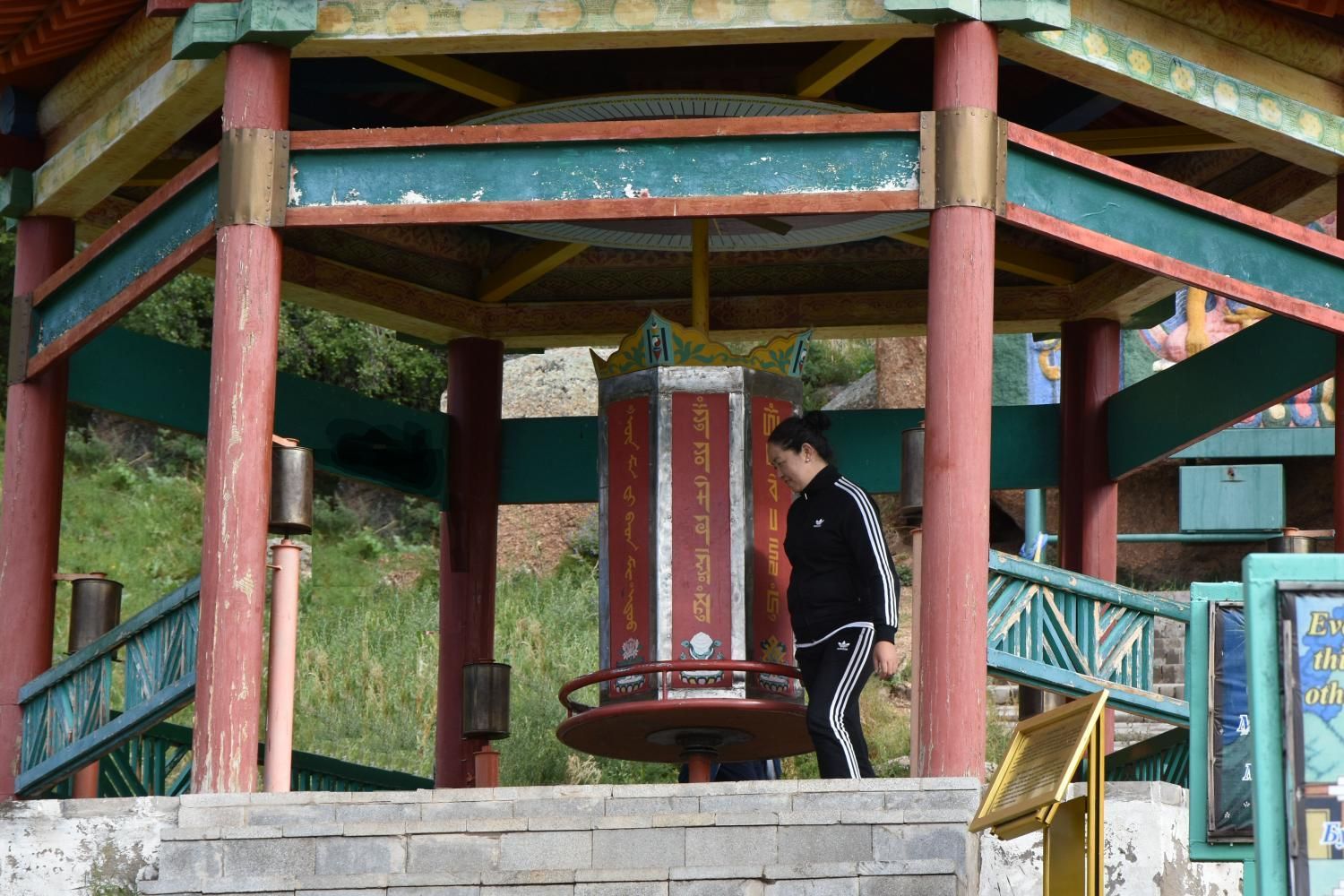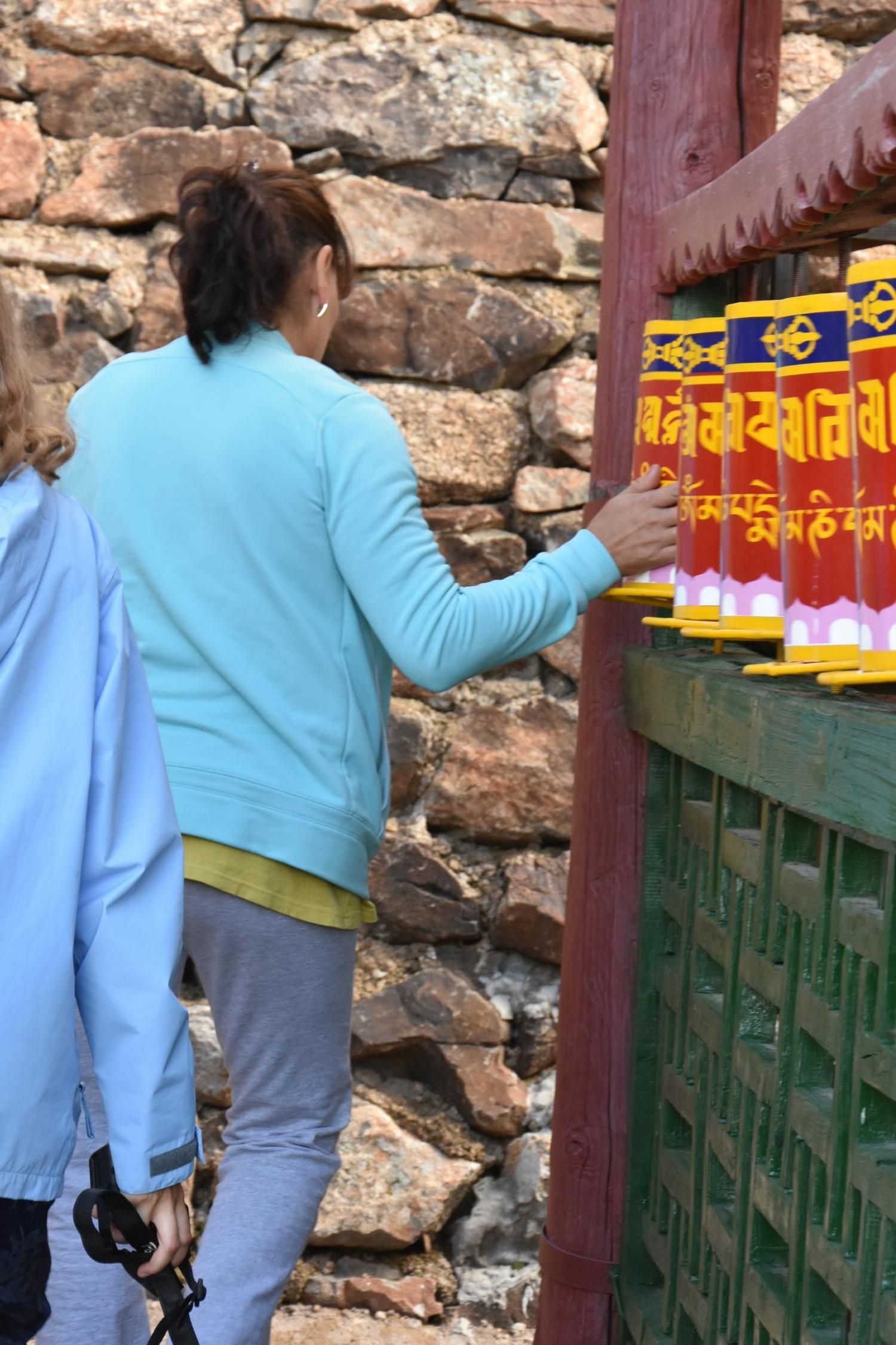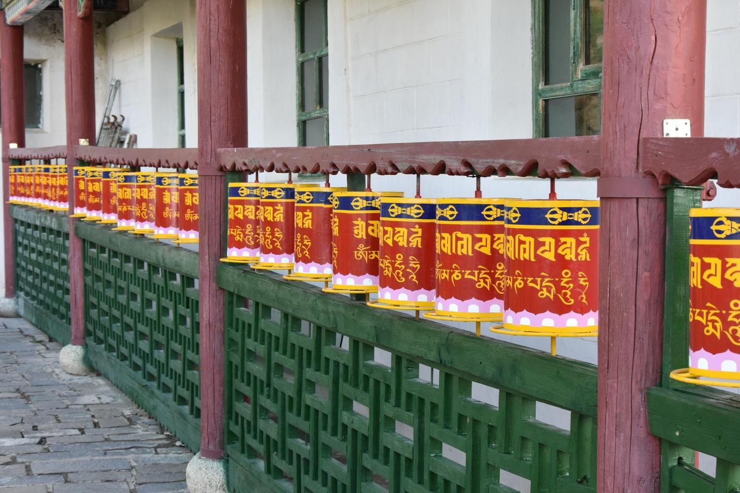108 moulins à prière, 108 marches pour monter au monastère, 108 récitations du mantra d'Aryapala (Avalokiteshvara) "Om Mani Padme Hum"