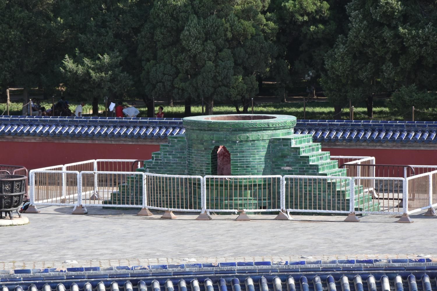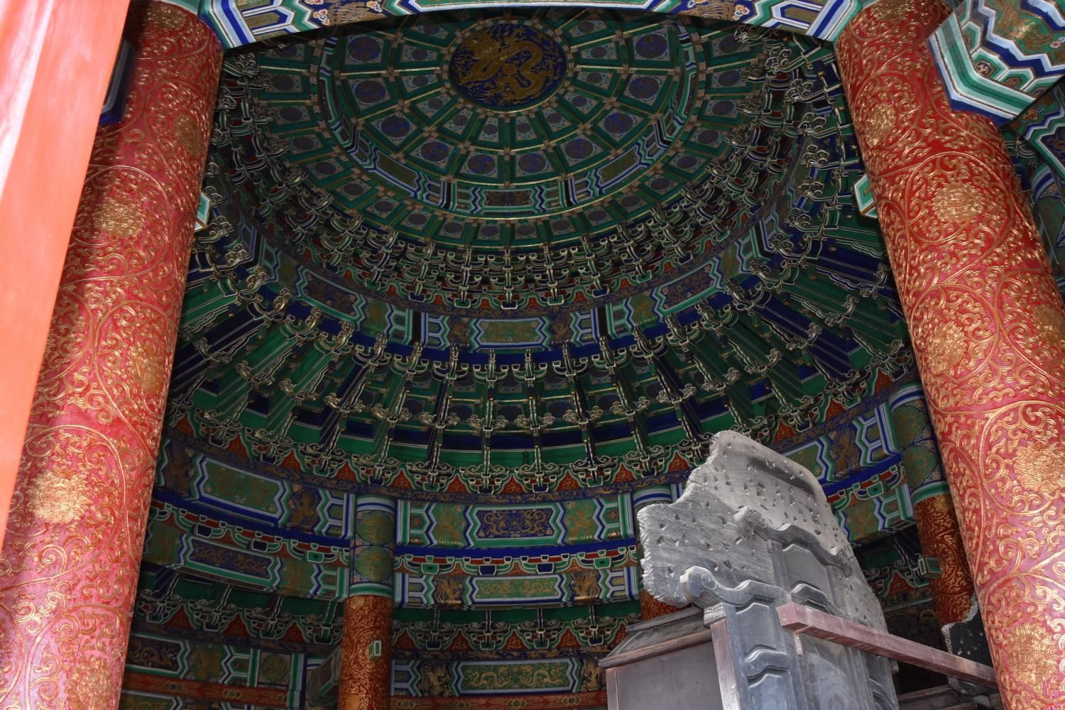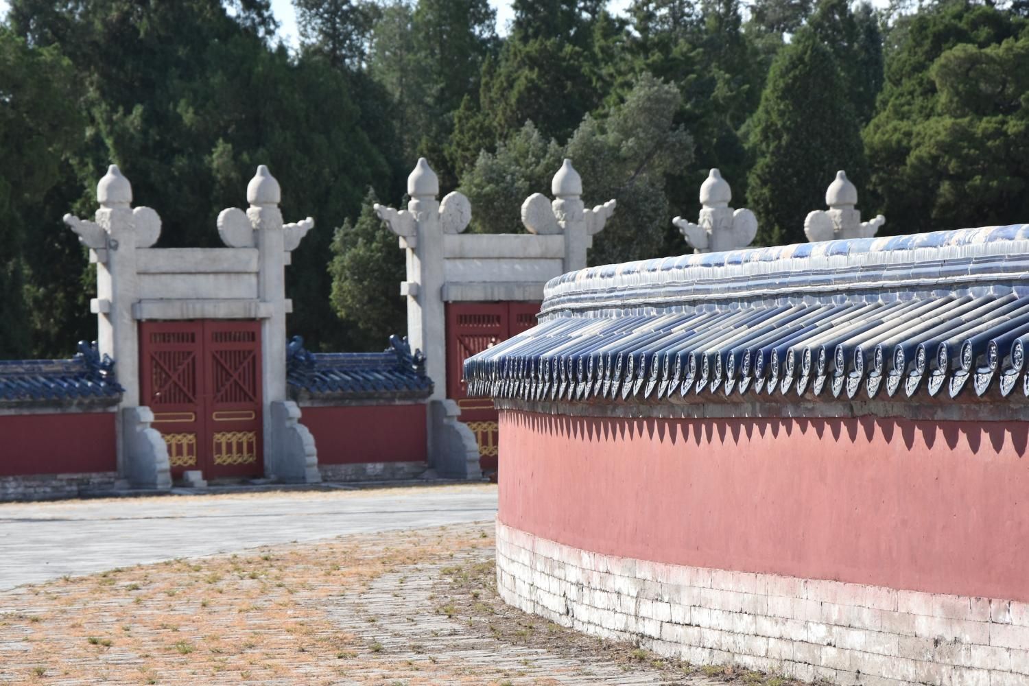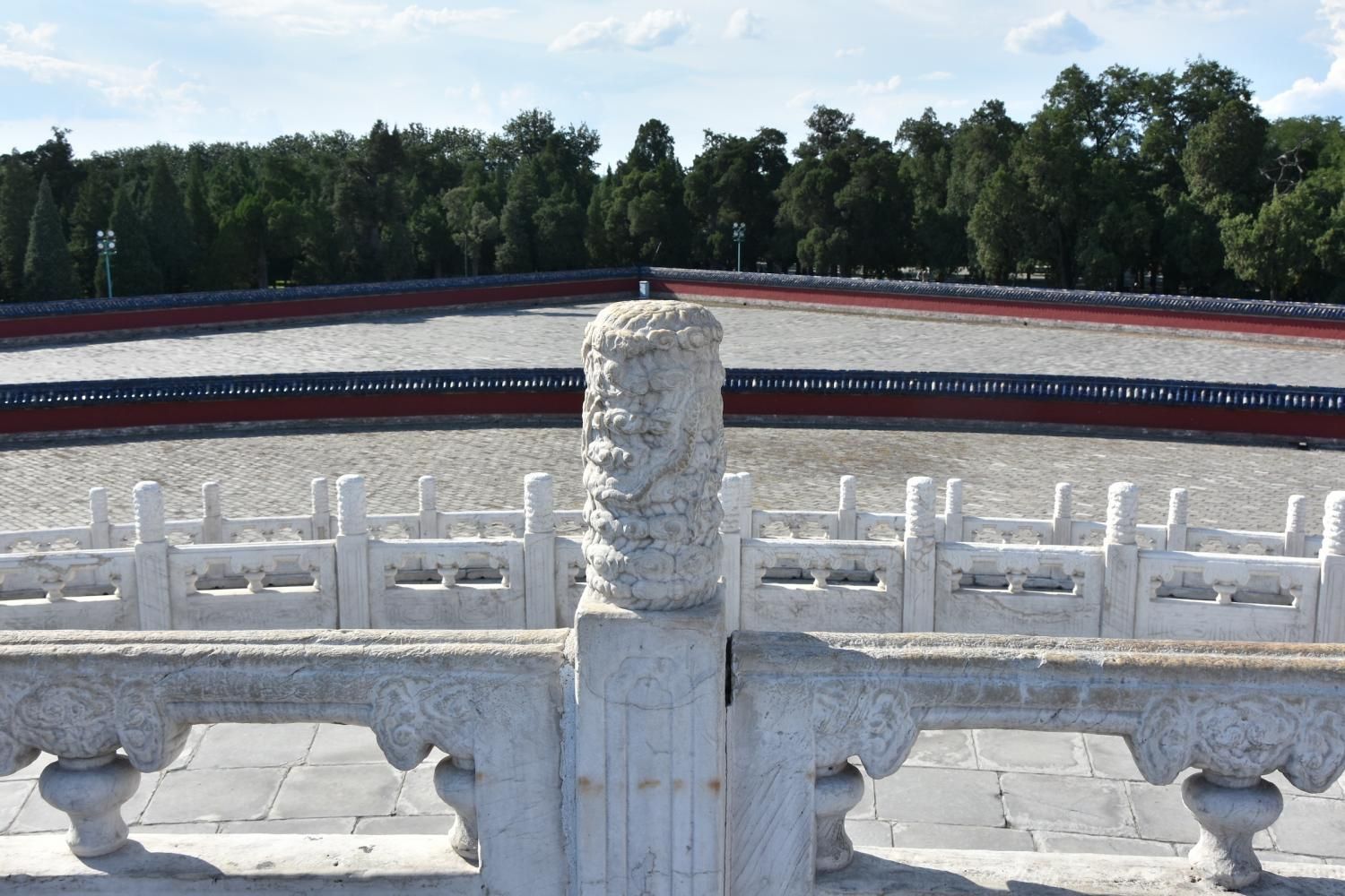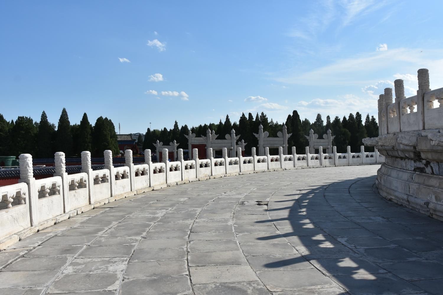 Si l'on rentre par la porte sud, nous découvrons en premier l'Autel Circulaire. Edifié en 1530 et reconstruit en 1740 sur une base carré représentant la Terre, l'autel rond (représentant le Ciel) est composé de trois terrasses culminant au centre dans une représentation symbolique du chiffre 9. Lorsqu'on se tient sur ce centre le bruit que l'on fait en tapant des mains ou en parlant est amplifié. Il faut se tenir exactement au centre pour que l'effet se produise. Le chiffre neuf et ses multiples ont une valeur symbolique: c'est le chiffre le plus élevé. Neuf cercles concentriques radient autour de la pierre centrale : le premier est composé de neuf pierres et le dernier de 81 pierres (9 par 9). Les marches qui permettent d'y accéder sont toujours par groupe de neuf. L'autel est entouré de 360 balustres de marbres. Jusqu'en 1911, avant la chute de l'empire, l'empereur venait y célébrer un cérémonial élaboré d'offrandes d'animaux sacrifiés, d'alcool, de tablettes de jades et de soies en faisant des prosternations toujours organisés autour du chiffre neuf. Au nord de l'Autel circulaire un enclos de 65 m de diamètre appelé le Mur de l'Echo entoure la Voûte Céleste Impériale. S'il n'y pas trop de monde, un chuchotement émis à l'opposé est tout à fait audible.