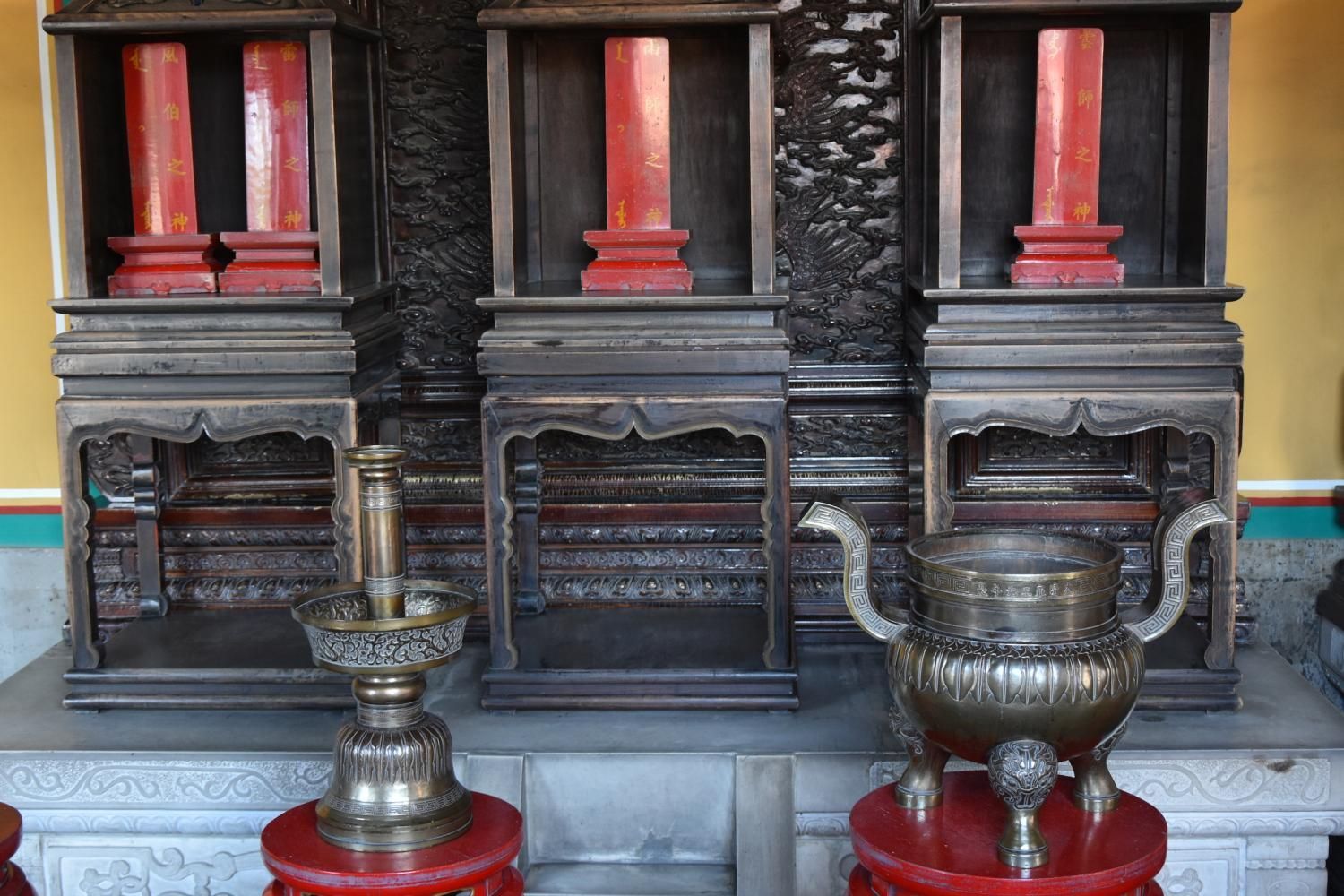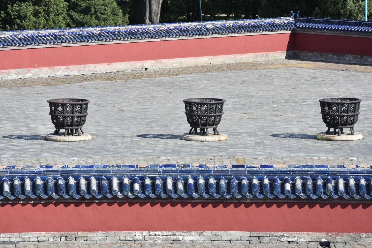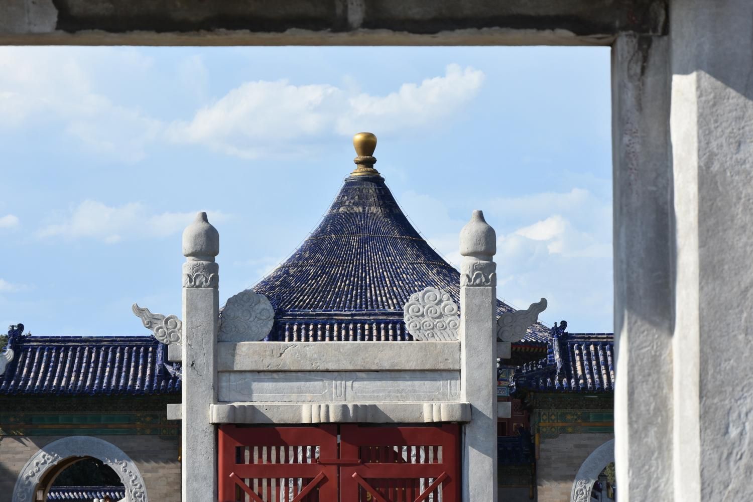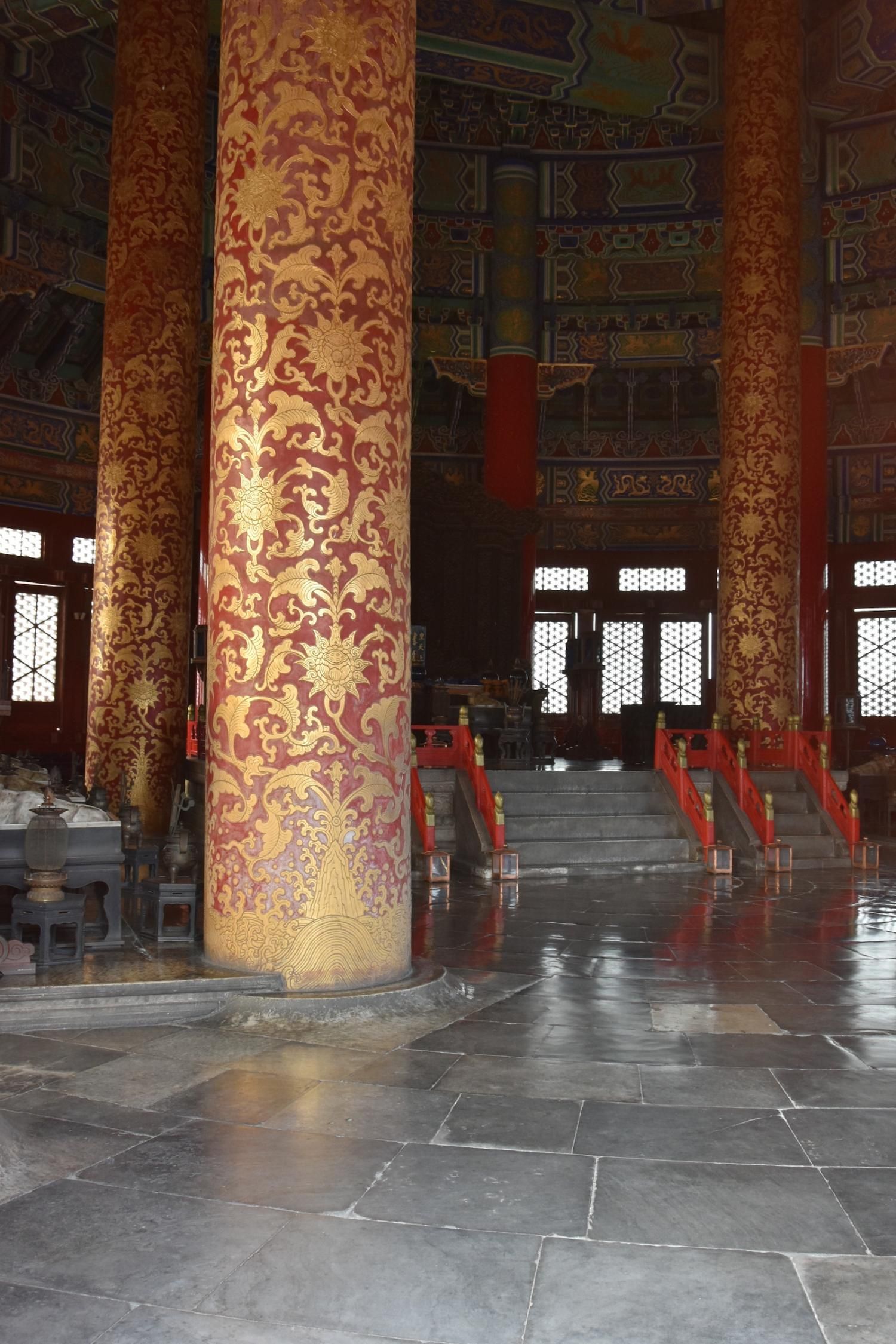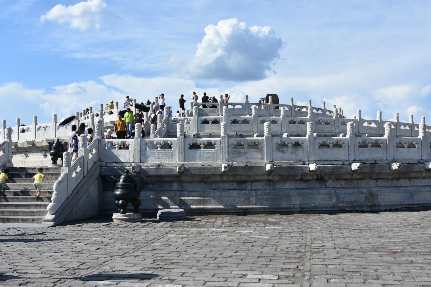 Si l'on rentre par la porte sud, nous découvrons en premier l'Autel Circulaire. Edifié en 1530 et reconstruit en 1740 sur une base carré représentant la Terre, l'autel rond (représentant le Ciel) est composé de trois terrasses culminant au centre dans une représentation symbolique du chiffre 9. Lorsqu'on se tient sur ce centre le bruit que l'on fait en tapant des mains ou en parlant est amplifié. Il faut se tenir exactement au centre pour que l'effet se produise. Le chiffre neuf et ses multiples ont une valeur symbolique: c'est le chiffre le plus élevé. Neuf cercles concentriques radient autour de la pierre centrale : le premier est composé de neuf pierres et le dernier de 81 pierres (9 par 9). Les marches qui permettent d'y accéder sont toujours par groupe de neuf. L'autel est entouré de 360 balustres de marbres. Jusqu'en 1911, avant la chute de l'empire, l'empereur venait y célébrer un cérémonial élaboré d'offrandes d'animaux sacrifiés, d'alcool, de tablettes de jades et de soies en faisant des prosternations toujours organisés autour du chiffre neuf. Au nord de l'Autel circulaire un enclos de 65 m de diamètre appelé le Mur de l'Echo entoure la Voûte Céleste Impériale. S'il n'y pas trop de monde, un chuchotement émis à l'opposé est tout à fait audible.