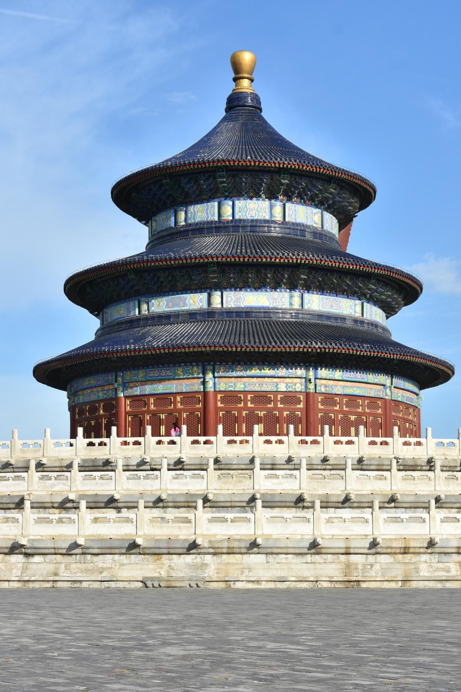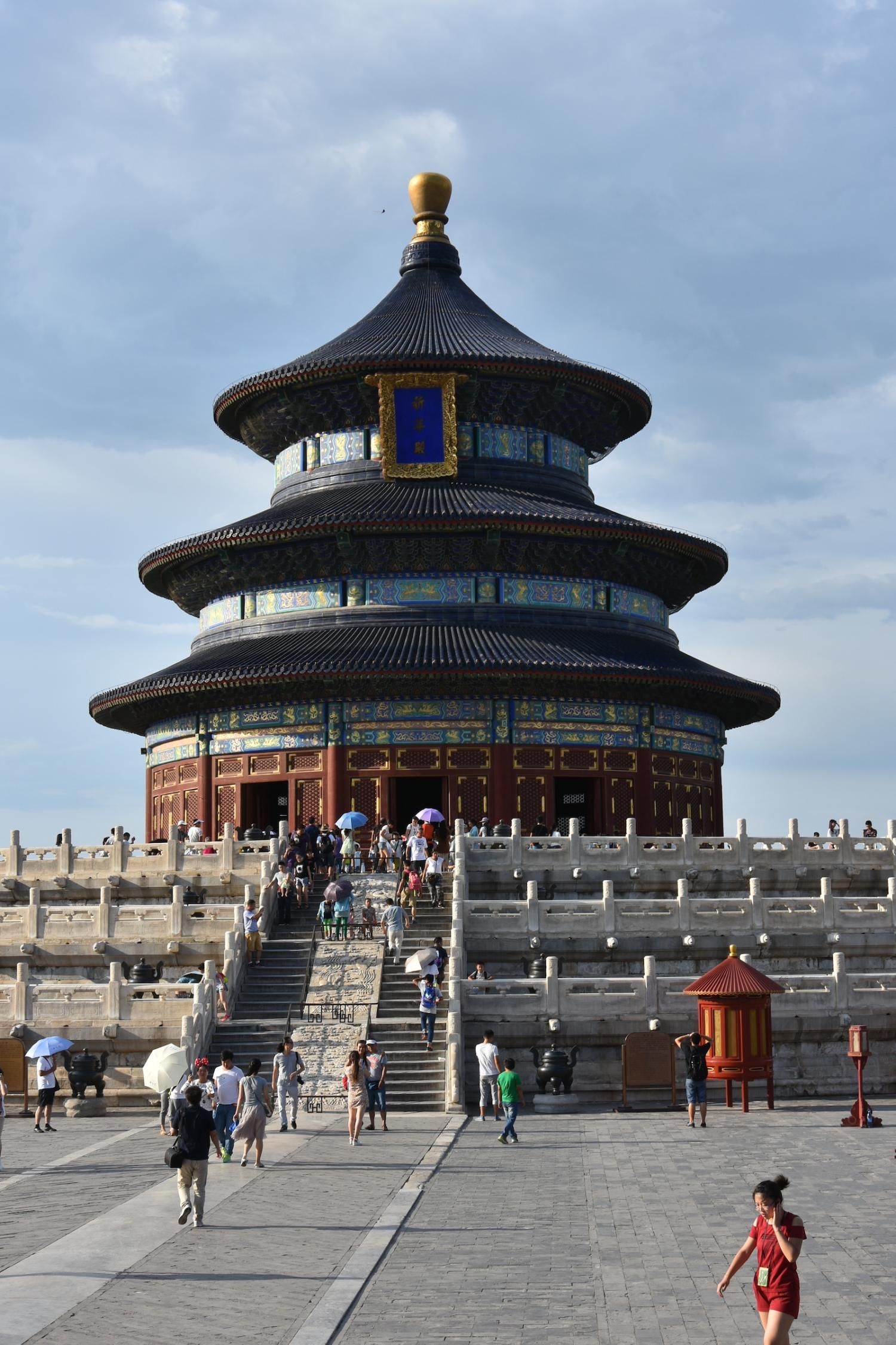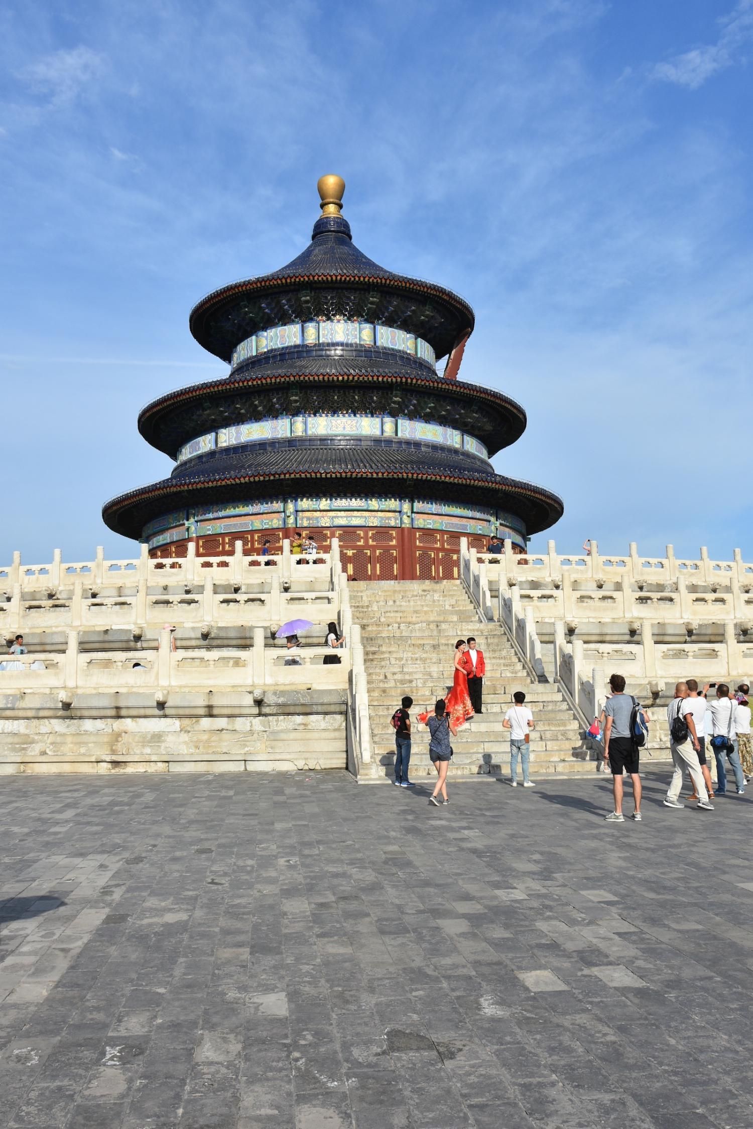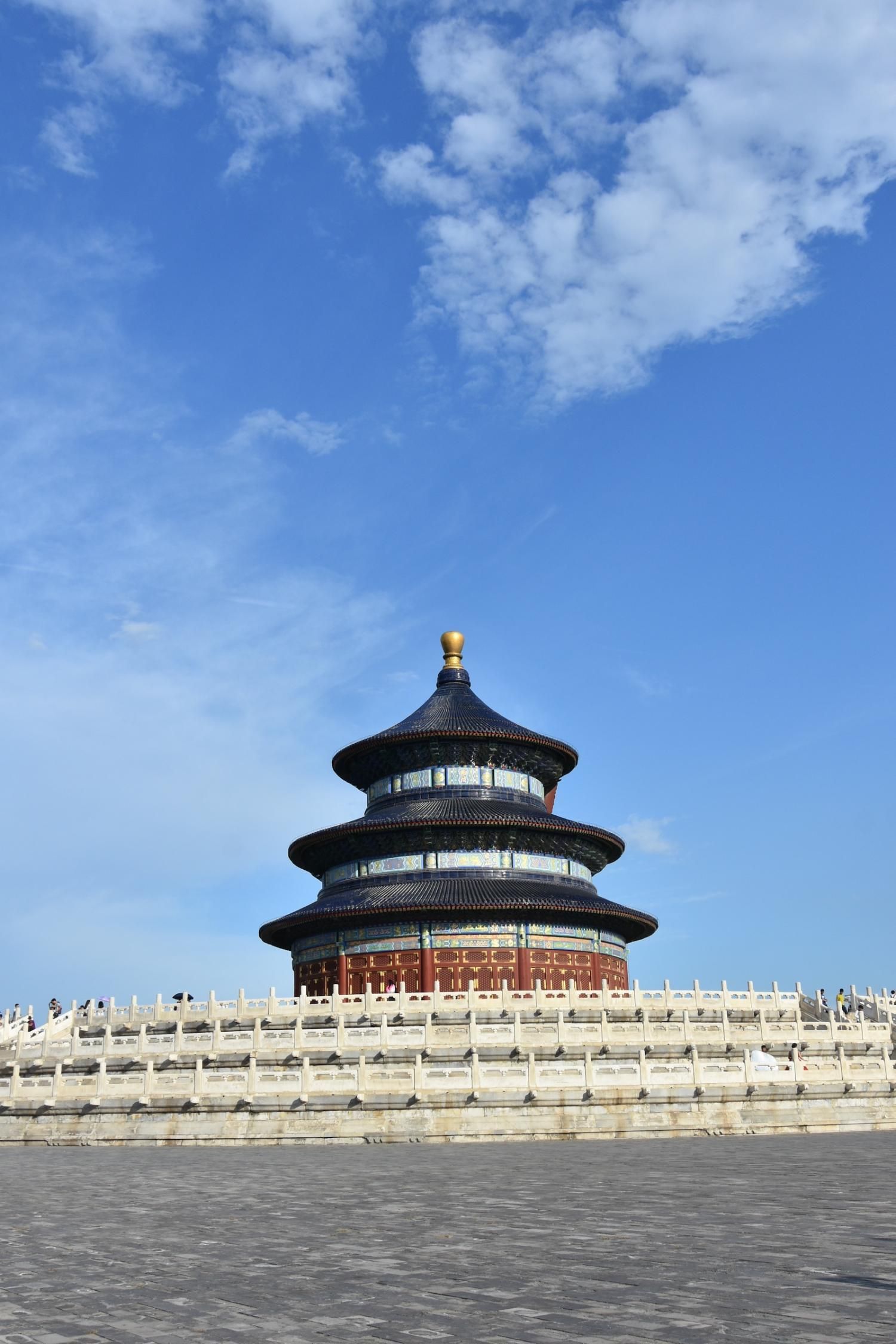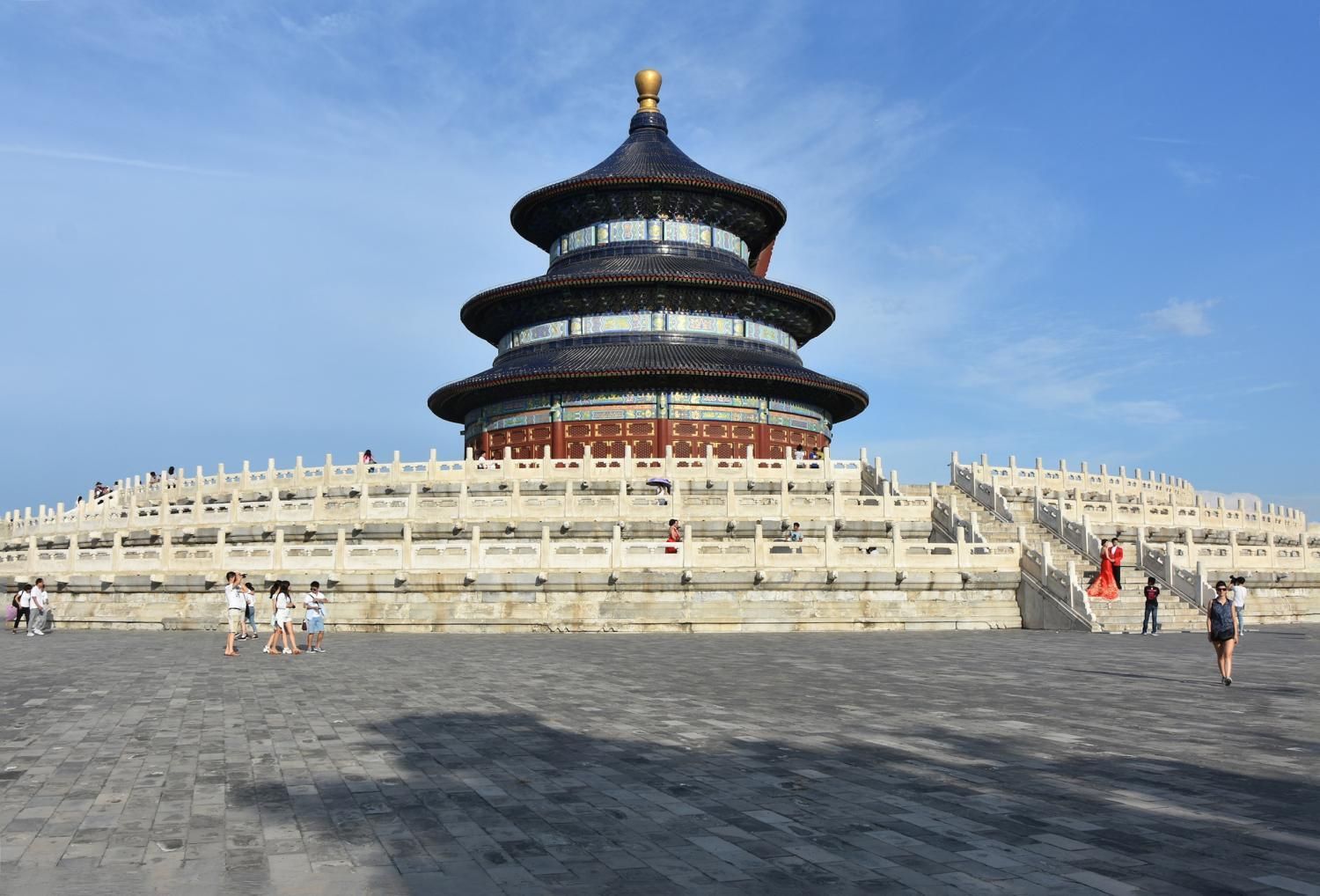 Le Temple du Ciel est situé à l'extrémité sud de la vieille ville de Pékin. Sa superficie est de 273 hectares, soit près du double de la Cité interdite. Le Temple du Ciel (天坛 Tiān Tán) est le lieu où les empereurs Ming et Qing venaient célébrer les rites et sacrifices pour rendre hommage au Ciel et l'implorer de donner de bonne récoltes. Son organisation est liée à la cosmologie chinoise dont l'équilibre reposait sur l'empereur par son attitude et le respect des rites. Les couleurs, les formes, les sons et la position des édifices représentent cette conception assez complexe de l'univers. Initialement appelé Temple du Ciel et de la Terre, il a été construit de 1406 à 1420 pendant le règne de l'Empereur Yongle, qui était aussi responsable de le construction de la Cité Interdite. Le temple fut agrandi et renommé Temple du Ciel pendant le règne de l'Empereur Jiajing au seizième siècle. Le Temple du Ciel a été rénové au dix-huitième siècle sous l'Empereur Qianlong. Le Temple des prières pour de bonnes moissons est un magnifique bâtiment sur trois terrasses de marbres superposés. Le temple fait 38 m de haut pour 30 m de diamètre, tout en bois, sans un seul clou ! Edifié en 1420, il fut incendié par la foudre en 1889 et reconstruit à l'identique. Il est le symbole de la Chine touristique. Sa photo se retrouve partout, avec sa triple toiture de tuiles bleues. A l'extérieur, au milieu de l 'escalier, trois pierres représentent les nuages, le phoenix et le dragon. A l'intérieur, quatre grosses colonnes symbolisent les quatre saisons au centre, puis 12 colones symbolisent les douze mois de l'année et encore douze autres les divisions d'une journée. Enfin, les 28 dernières représentent les 28 constellations. A l'est se situe le Temple du Jeûne. C'est ici que l'empereur et ses ministres observaient un jeûne de trois jours avant chaque cérémonie.