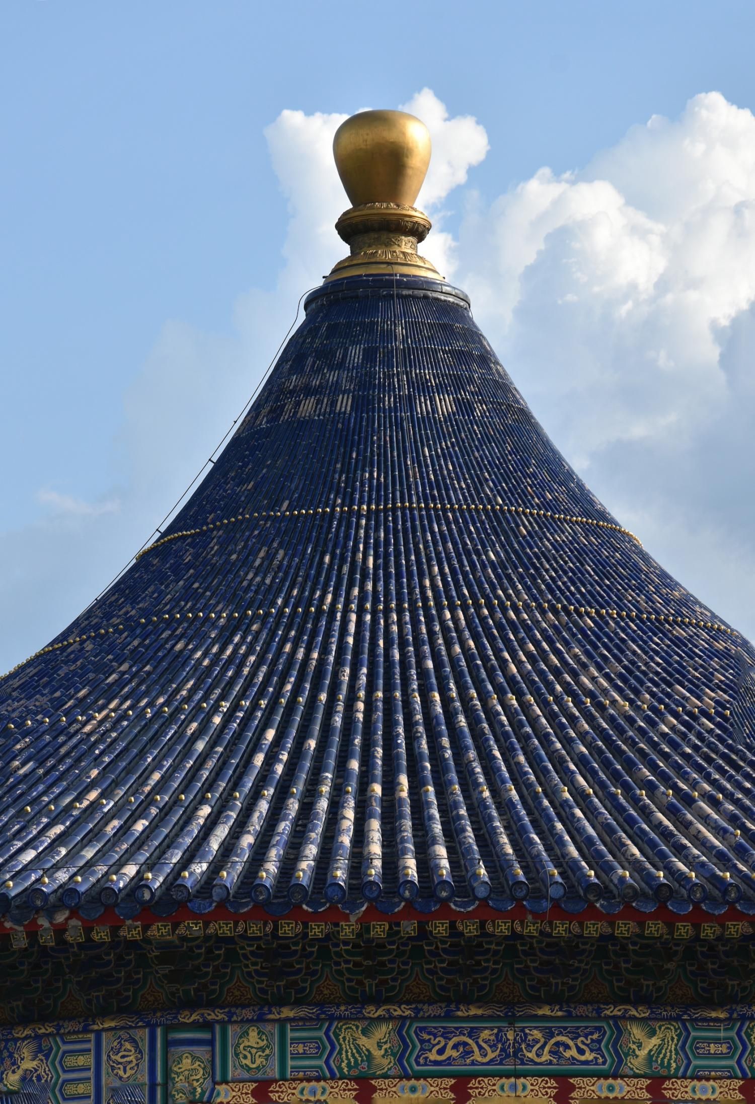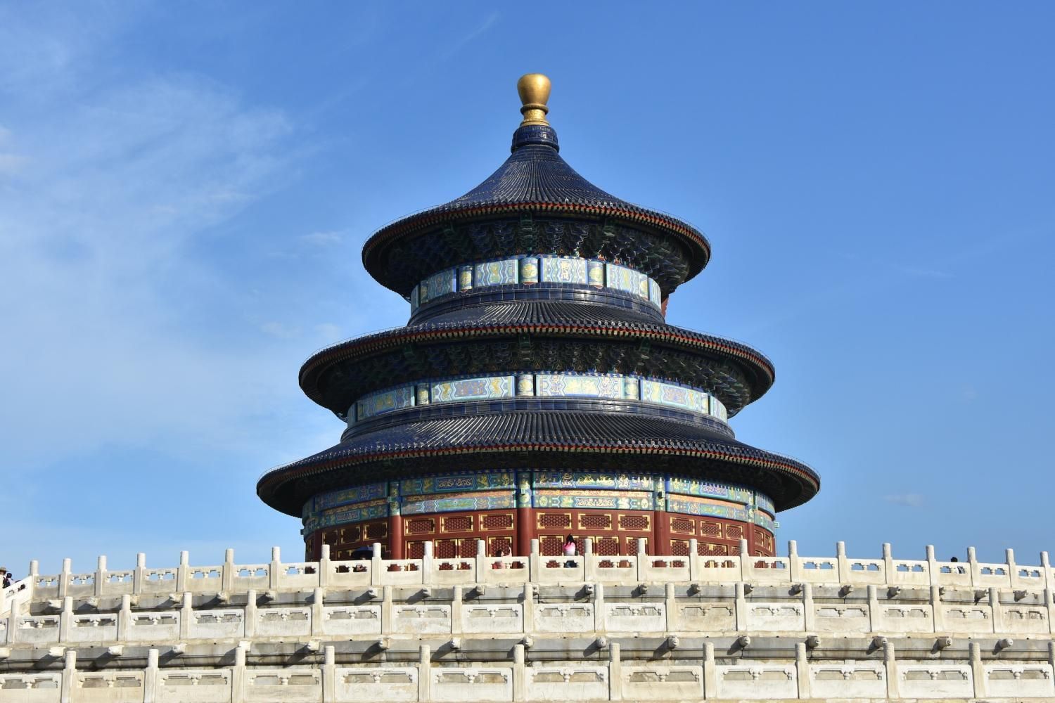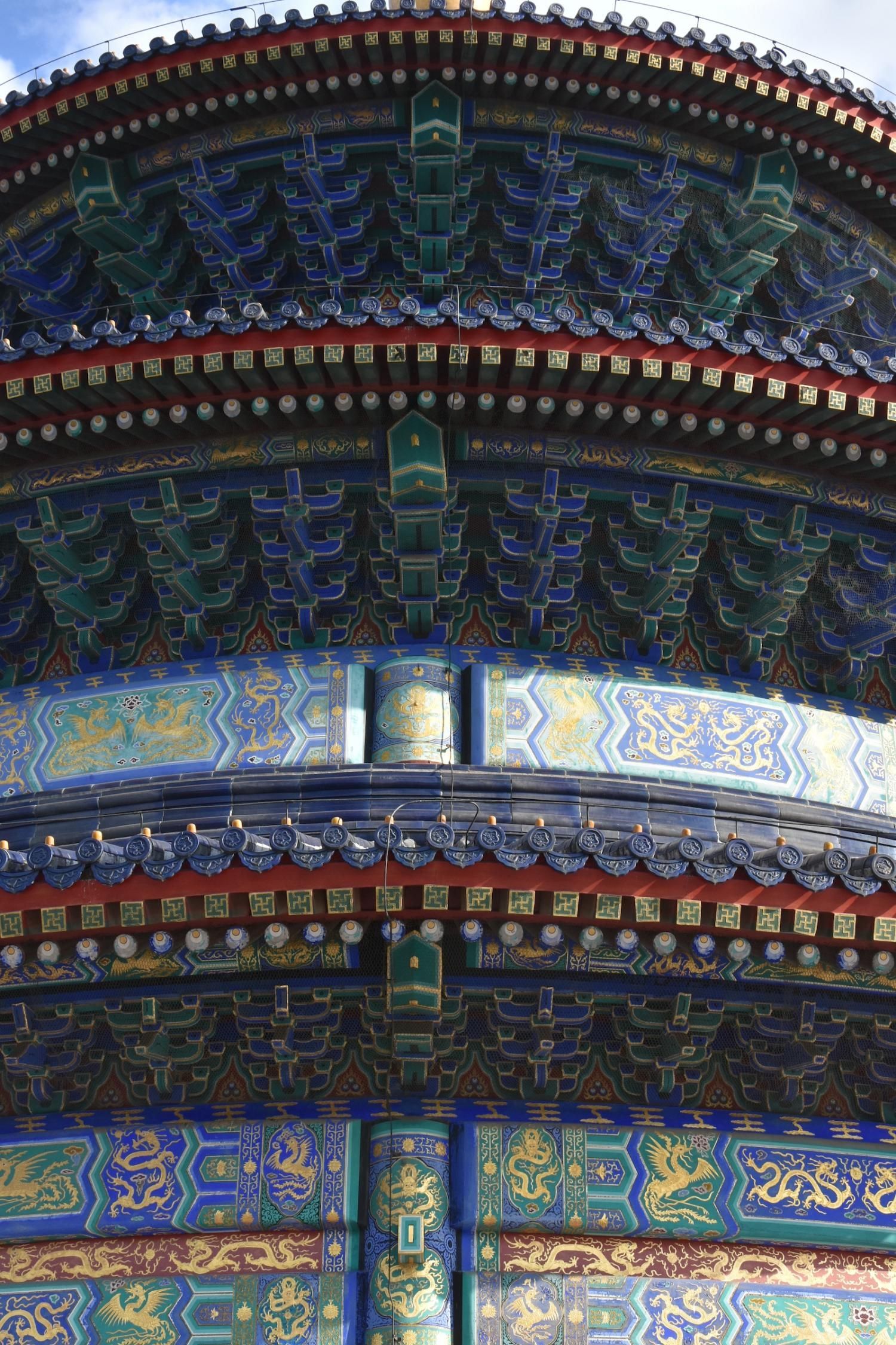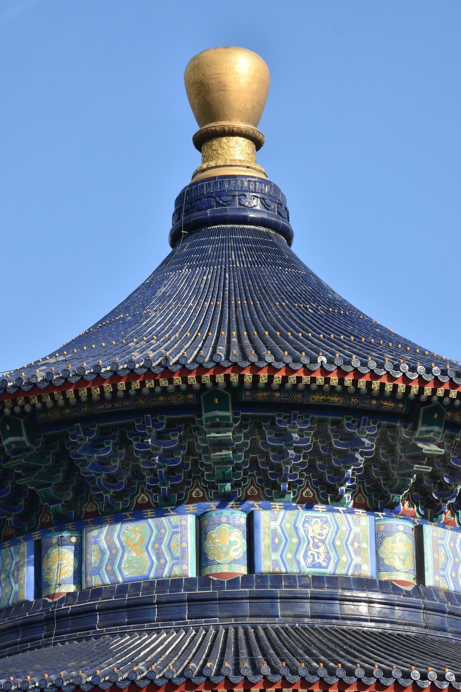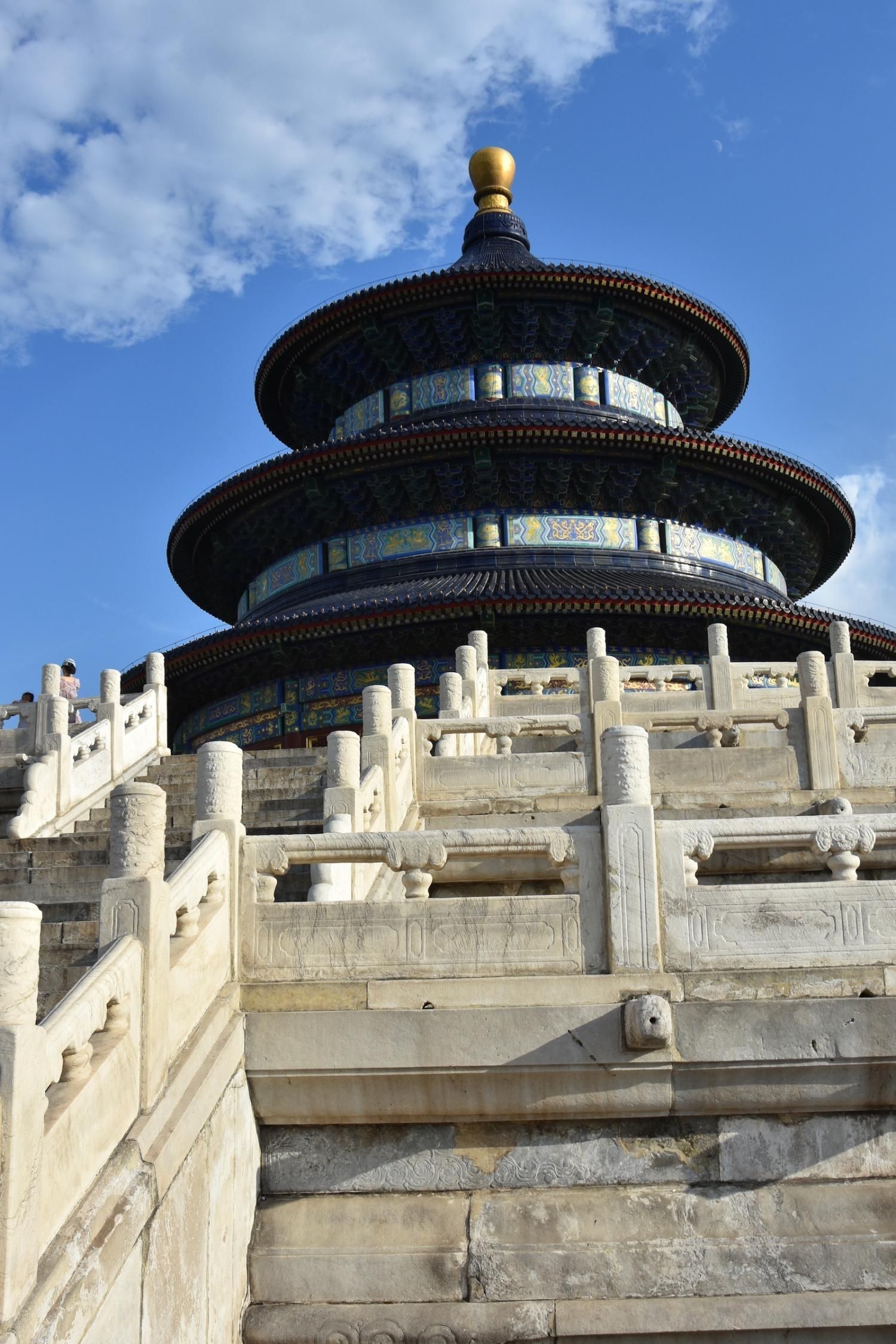 Le Temple du Ciel est situé à l'extrémité sud de la vieille ville de Pékin. Sa superficie est de 273 hectares, soit près du double de la Cité interdite. Le Temple du Ciel (天坛 Tiān Tán) est le lieu où les empereurs Ming et Qing venaient célébrer les rites et sacrifices pour rendre hommage au Ciel et l'implorer de donner de bonne récoltes. Son organisation est liée à la cosmologie chinoise dont l'équilibre reposait sur l'empereur par son attitude et le respect des rites. Les couleurs, les formes, les sons et la position des édifices représentent cette conception assez complexe de l'univers. Initialement appelé Temple du Ciel et de la Terre, il a été construit de 1406 à 1420 pendant le règne de l'Empereur Yongle, qui était aussi responsable de le construction de la Cité Interdite. Le temple fut agrandi et renommé Temple du Ciel pendant le règne de l'Empereur Jiajing au seizième siècle. Le Temple du Ciel a été rénové au dix-huitième siècle sous l'Empereur Qianlong. Le Temple des prières pour de bonnes moissons est un magnifique bâtiment sur trois terrasses de marbres superposés. Le temple fait 38 m de haut pour 30 m de diamètre, tout en bois, sans un seul clou ! Edifié en 1420, il fut incendié par la foudre en 1889 et reconstruit à l'identique. Il est le symbole de la Chine touristique. Sa photo se retrouve partout, avec sa triple toiture de tuiles bleues. A l'extérieur, au milieu de l 'escalier, trois pierres représentent les nuages, le phoenix et le dragon. A l'intérieur, quatre grosses colonnes symbolisent les quatre saisons au centre, puis 12 colones symbolisent les douze mois de l'année et encore douze autres les divisions d'une journée. Enfin, les 28 dernières représentent les 28 constellations. A l'est se situe le Temple du Jeûne. C'est ici que l'empereur et ses ministres observaient un jeûne de trois jours avant chaque cérémonie.