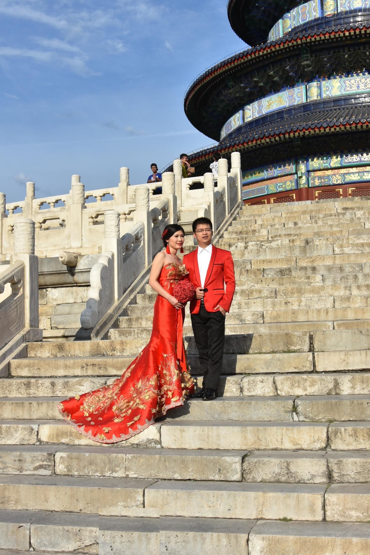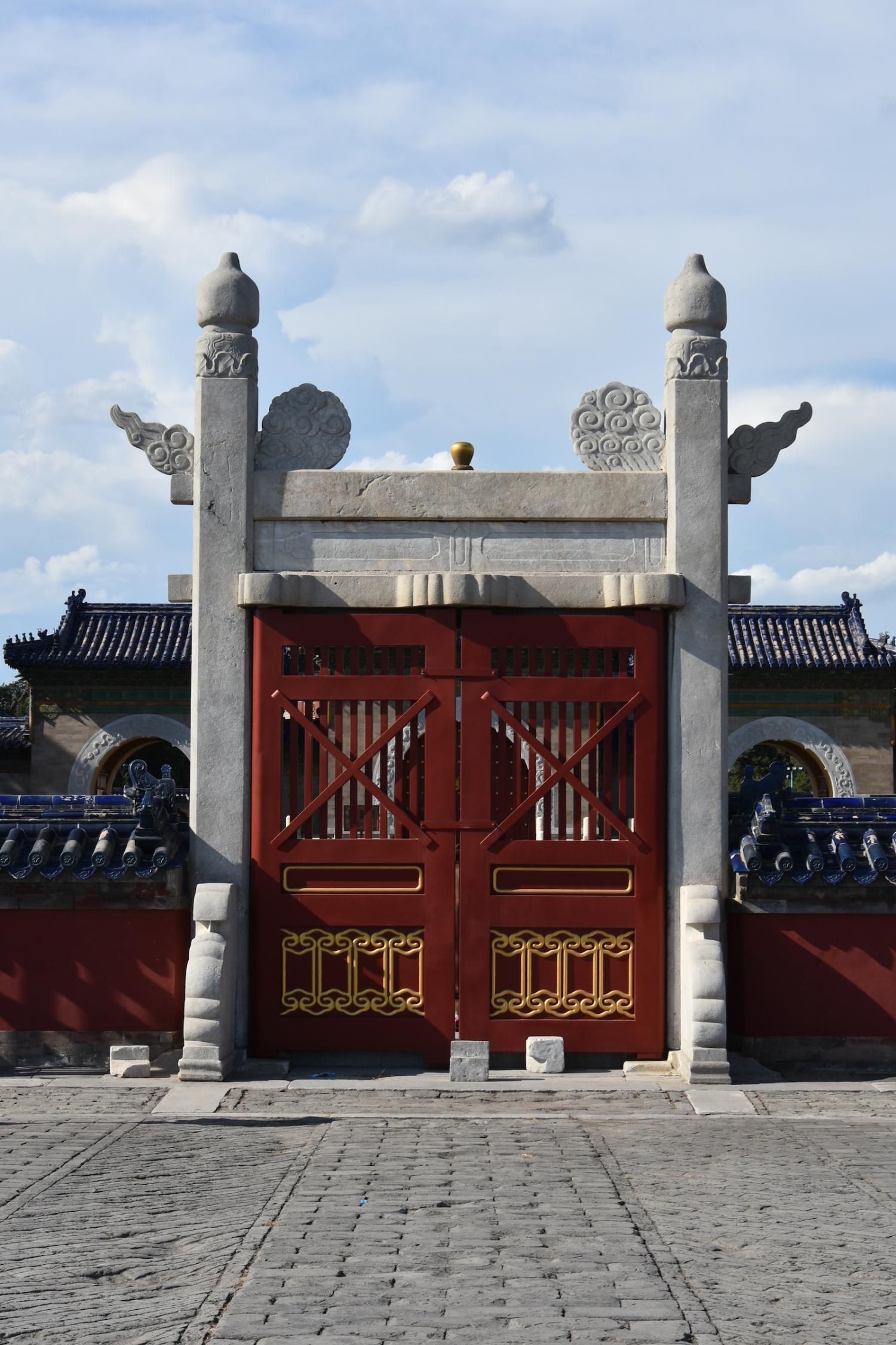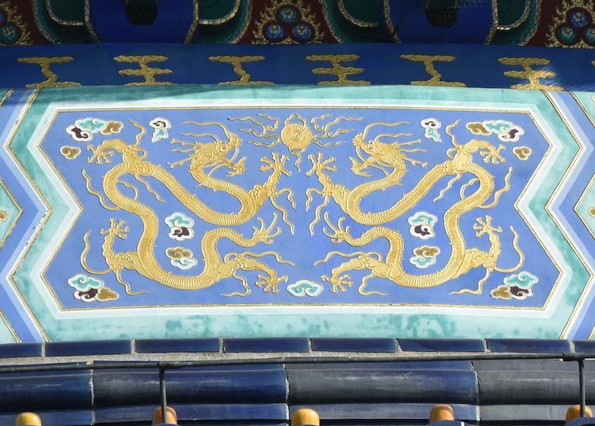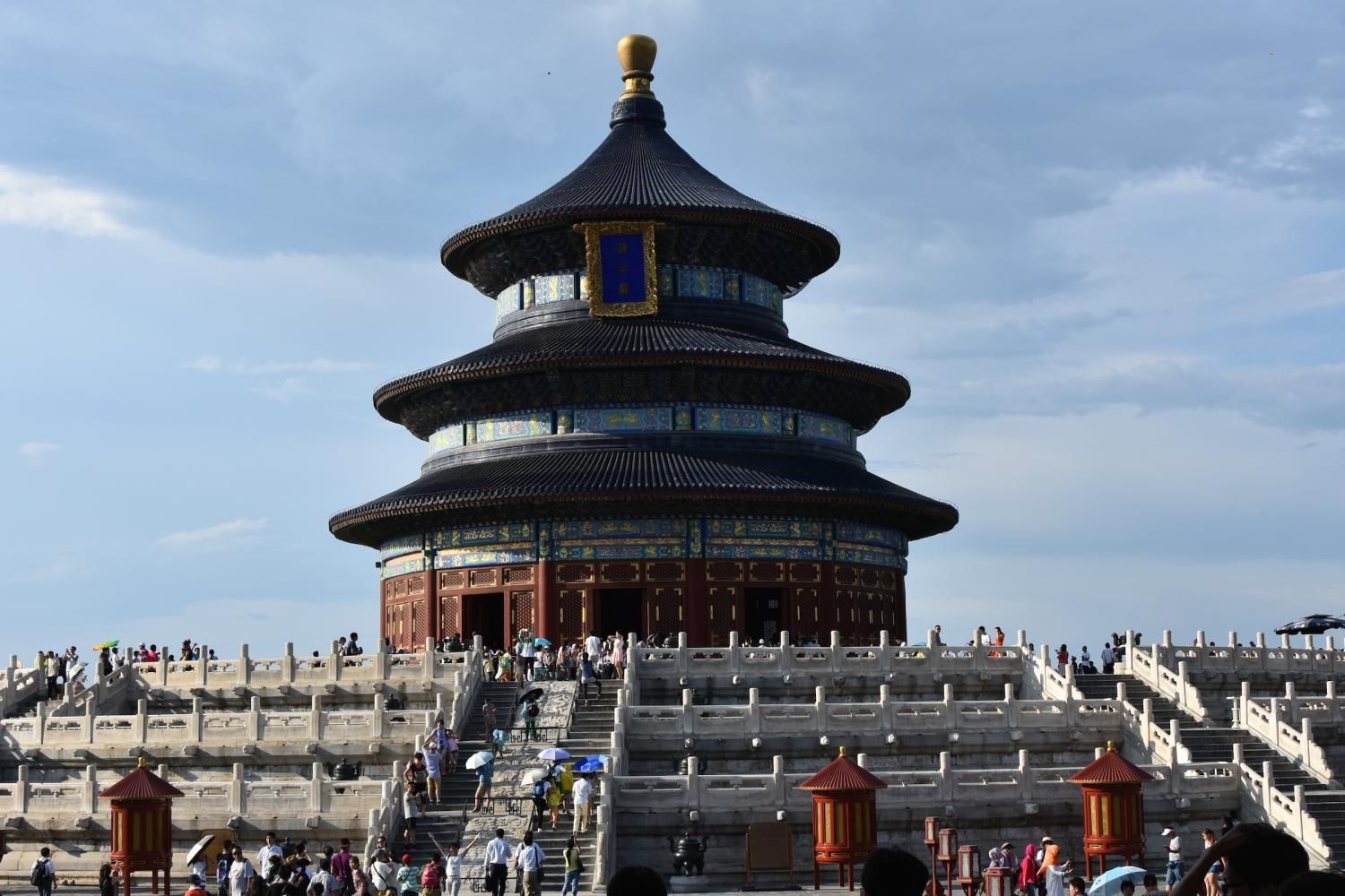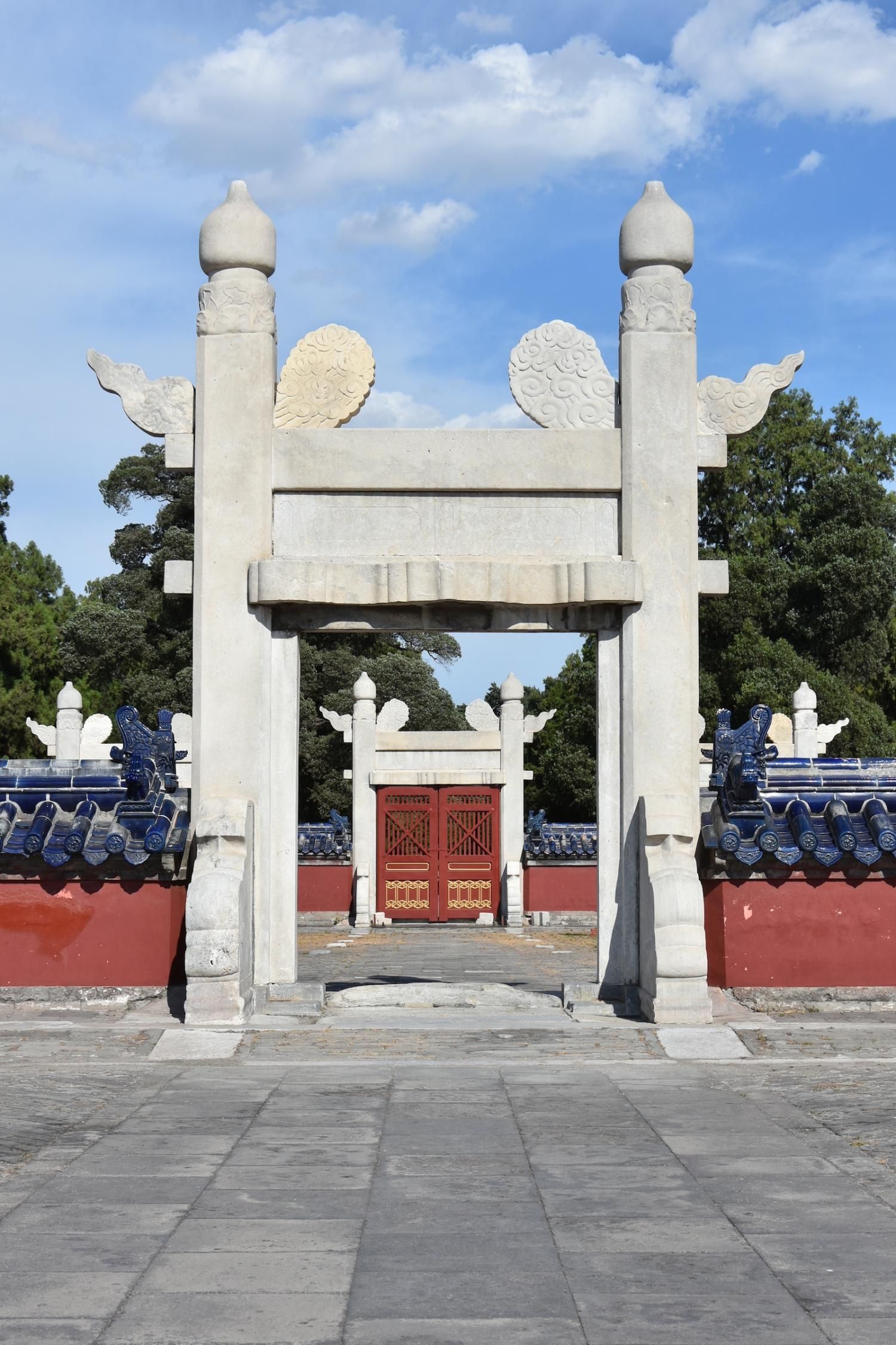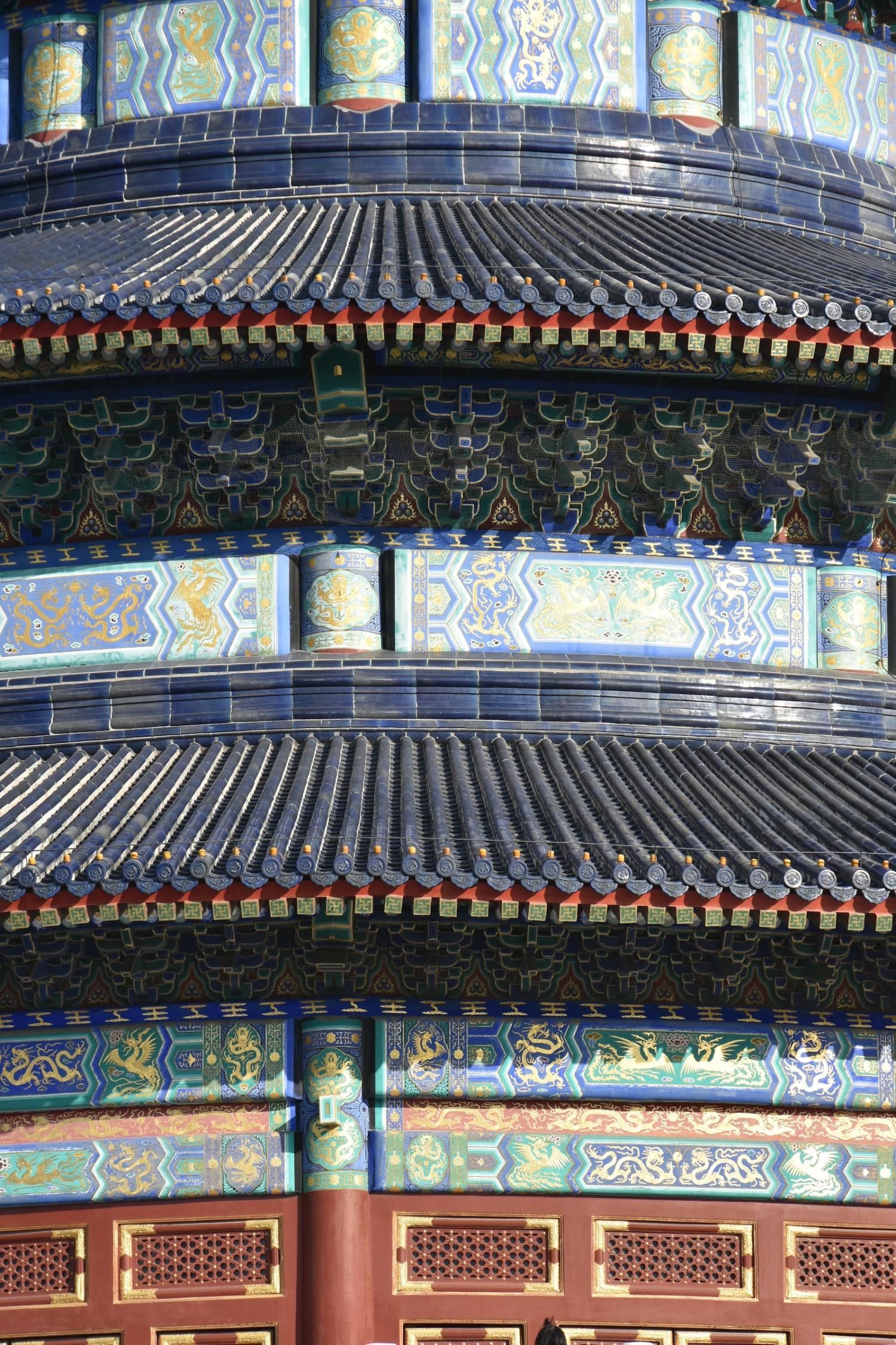 Le Temple du Ciel est situé à l'extrémité sud de la vieille ville de Pékin. Sa superficie est de 273 hectares, soit près du double de la Cité interdite. Le Temple du Ciel (天坛 Tiān Tán) est le lieu où les empereurs Ming et Qing venaient célébrer les rites et sacrifices pour rendre hommage au Ciel et l'implorer de donner de bonne récoltes. Son organisation est liée à la cosmologie chinoise dont l'équilibre reposait sur l'empereur par son attitude et le respect des rites. Les couleurs, les formes, les sons et la position des édifices représentent cette conception assez complexe de l'univers. Initialement appelé Temple du Ciel et de la Terre, il a été construit de 1406 à 1420 pendant le règne de l'Empereur Yongle, qui était aussi responsable de le construction de la Cité Interdite. Le temple fut agrandi et renommé Temple du Ciel pendant le règne de l'Empereur Jiajing au seizième siècle. Le Temple du Ciel a été rénové au dix-huitième siècle sous l'Empereur Qianlong. Le Temple des prières pour de bonnes moissons est un magnifique bâtiment sur trois terrasses de marbres superposés. Le temple fait 38 m de haut pour 30 m de diamètre, tout en bois, sans un seul clou ! Edifié en 1420, il fut incendié par la foudre en 1889 et reconstruit à l'identique. Il est le symbole de la Chine touristique. Sa photo se retrouve partout, avec sa triple toiture de tuiles bleues. A l'extérieur, au milieu de l 'escalier, trois pierres représentent les nuages, le phoenix et le dragon. A l'intérieur, quatre grosses colonnes symbolisent les quatre saisons au centre, puis 12 colones symbolisent les douze mois de l'année et encore douze autres les divisions d'une journée. Enfin, les 28 dernières représentent les 28 constellations. A l'est se situe le Temple du Jeûne. C'est ici que l'empereur et ses ministres observaient un jeûne de trois jours avant chaque cérémonie.
