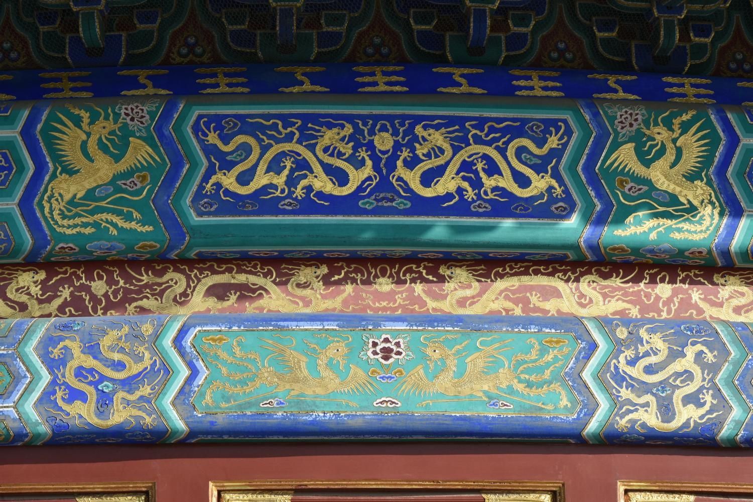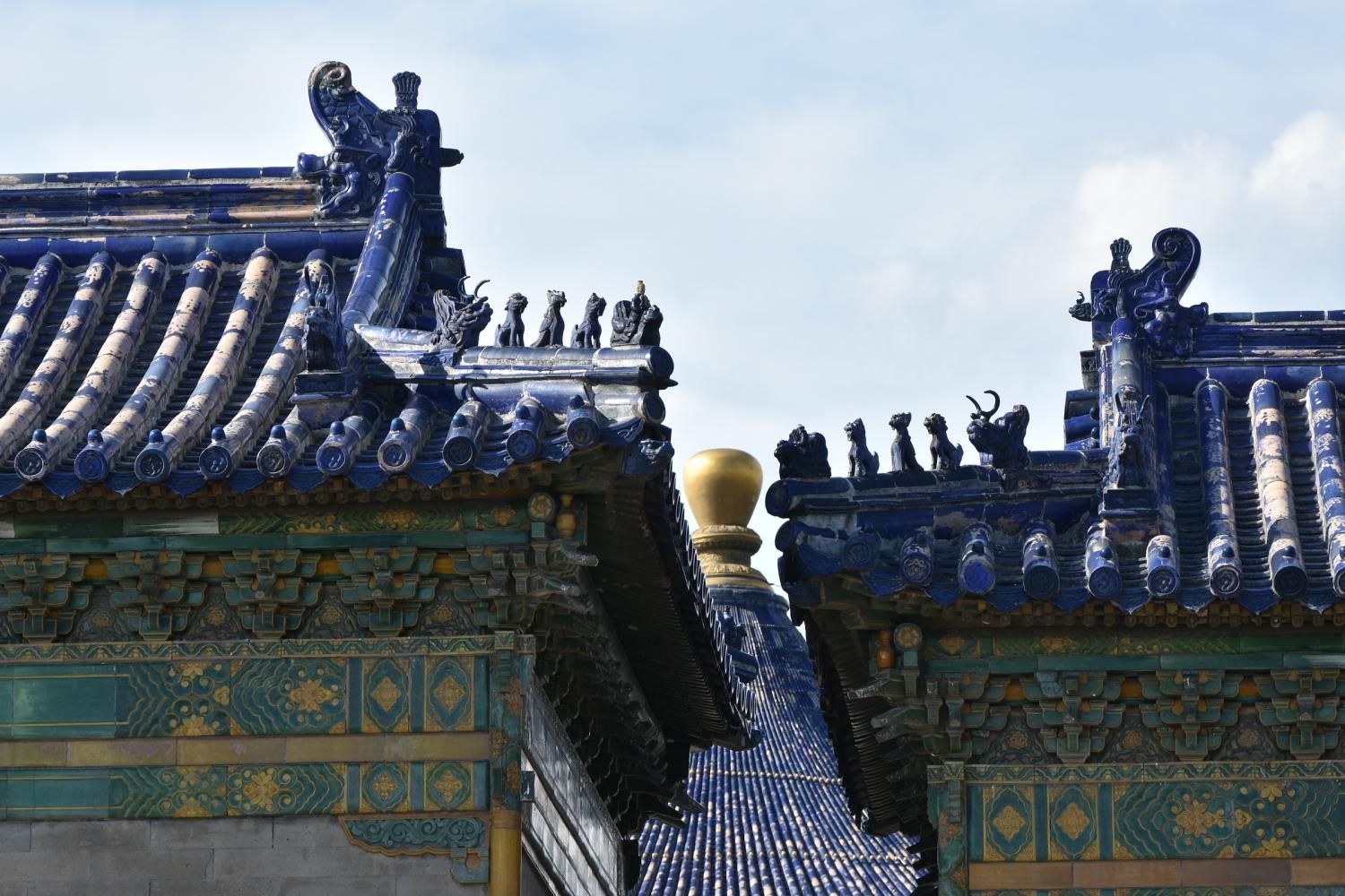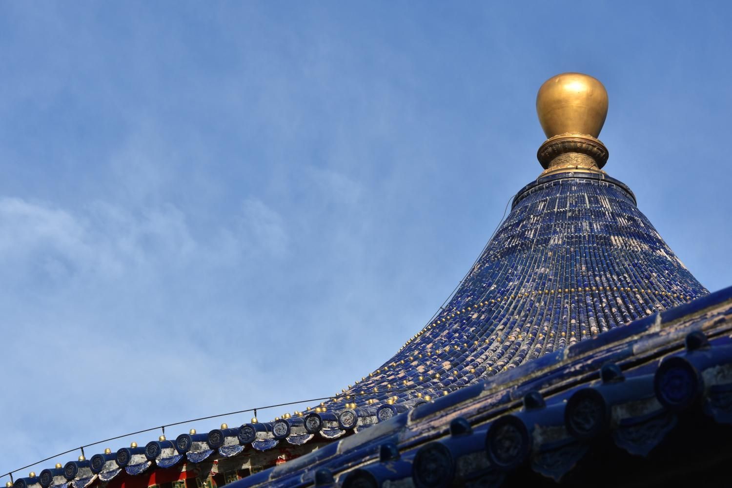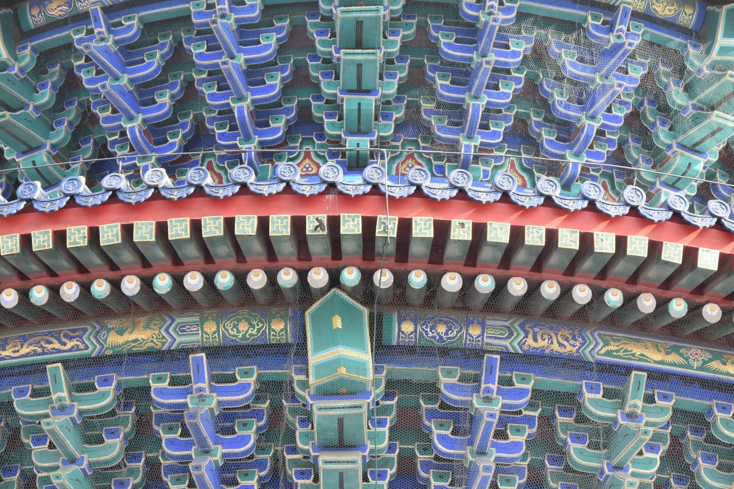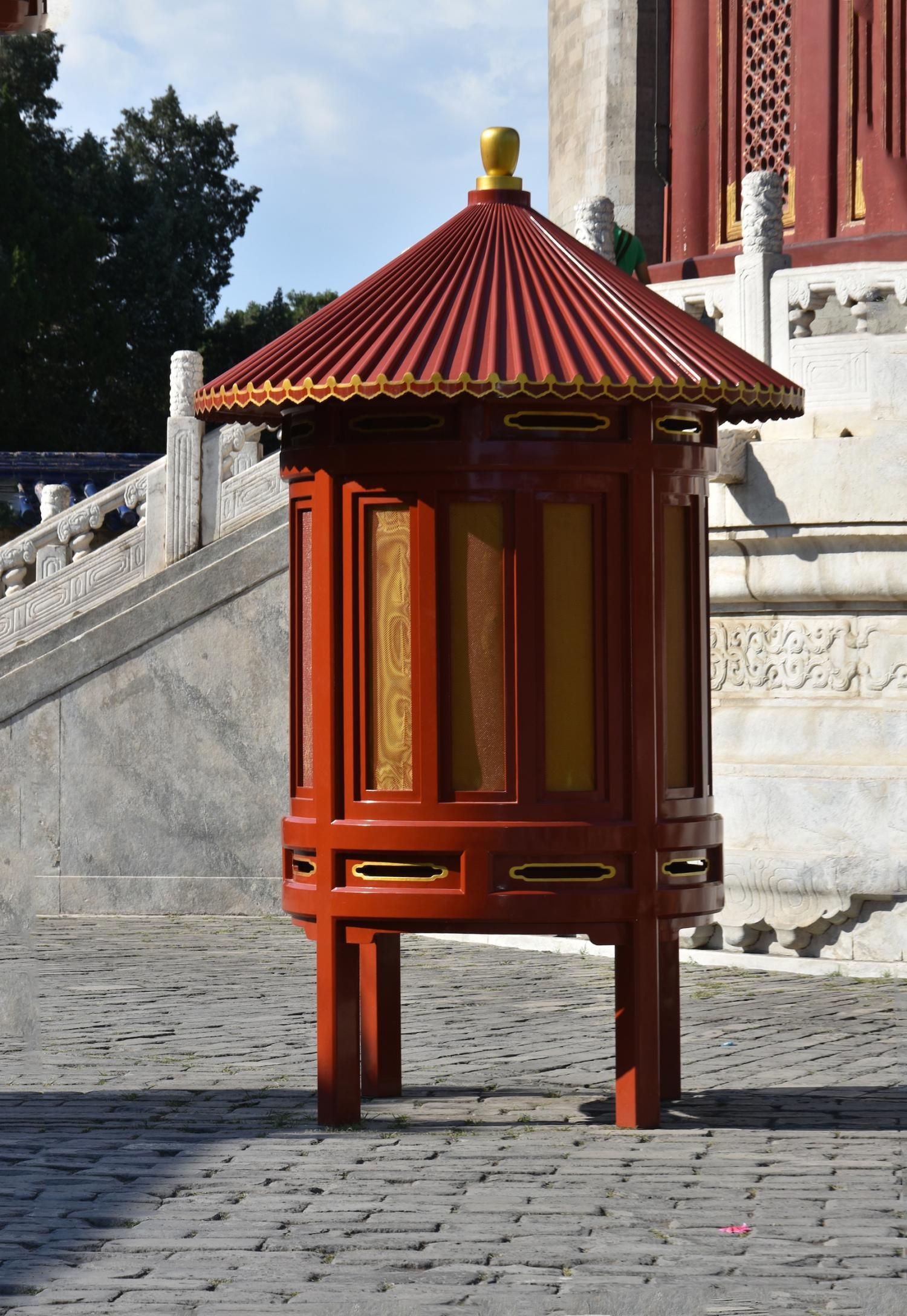 Le Temple du Ciel est situé à l'extrémité sud de la vieille ville de Pékin. Sa superficie est de 273 hectares, soit près du double de la Cité interdite. Le Temple du Ciel (天坛 Tiān Tán) est le lieu où les empereurs Ming et Qing venaient célébrer les rites et sacrifices pour rendre hommage au Ciel et l'implorer de donner de bonne récoltes. Son organisation est liée à la cosmologie chinoise dont l'équilibre reposait sur l'empereur par son attitude et le respect des rites. Les couleurs, les formes, les sons et la position des édifices représentent cette conception assez complexe de l'univers. Initialement appelé Temple du Ciel et de la Terre, il a été construit de 1406 à 1420 pendant le règne de l'Empereur Yongle, qui était aussi responsable de le construction de la Cité Interdite. Le temple fut agrandi et renommé Temple du Ciel pendant le règne de l'Empereur Jiajing au seizième siècle. Le Temple du Ciel a été rénové au dix-huitième siècle sous l'Empereur Qianlong. Le Temple des prières pour de bonnes moissons est un magnifique bâtiment sur trois terrasses de marbres superposés. Le temple fait 38 m de haut pour 30 m de diamètre, tout en bois, sans un seul clou ! Edifié en 1420, il fut incendié par la foudre en 1889 et reconstruit à l'identique. Il est le symbole de la Chine touristique. Sa photo se retrouve partout, avec sa triple toiture de tuiles bleues. A l'extérieur, au milieu de l 'escalier, trois pierres représentent les nuages, le phoenix et le dragon. A l'intérieur, quatre grosses colonnes symbolisent les quatre saisons au centre, puis 12 colones symbolisent les douze mois de l'année et encore douze autres les divisions d'une journée. Enfin, les 28 dernières représentent les 28 constellations. A l'est se situe le Temple du Jeûne. C'est ici que l'empereur et ses ministres observaient un jeûne de trois jours avant chaque cérémonie.