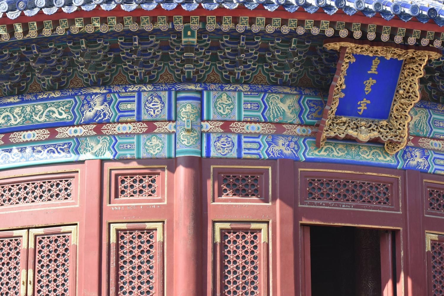 Dans la Voûte Céleste Impériale était gardées les tablettes du Ciel et des Empereurs décédés. Ce bâtiment octogonal fut construit à la même époque que l'Autel circulaire et suivant les mêmes proportions que le Temple de la Prière pour les bonnes moissons. La Voûte Céleste Impériale est encadrée de deux édifices. Celui à l'est contient de très belles peintures. Il est dédié au Yang : divinité du soleil, étoile polaire, planètes, etc. Celui à l'ouest est dédié au Yin : divinité de la lune, nuage, pluie, etc. Il présente une double rangée de belles poutres polychromes. Les trois dalles sonores sur l'allée possède aussi une curiosité intéressante : si l'on frappe dans ses mains devant la première dalle on obtient un écho simple, puis si on refait l'expérience devant la seconde l'écho est double et triple devant la troisième.